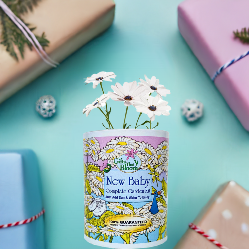 Inside, you'll find Daisy seeds, a peat pellet (soil), a pot for growing, and easy-to-follow planting instructions, all packed into one convenient and delightful package. The cheerful blooms of Daisies symbolize innocence, purity, and the joy of new beginnings, making them an ideal flower to welcome a new baby into the world.