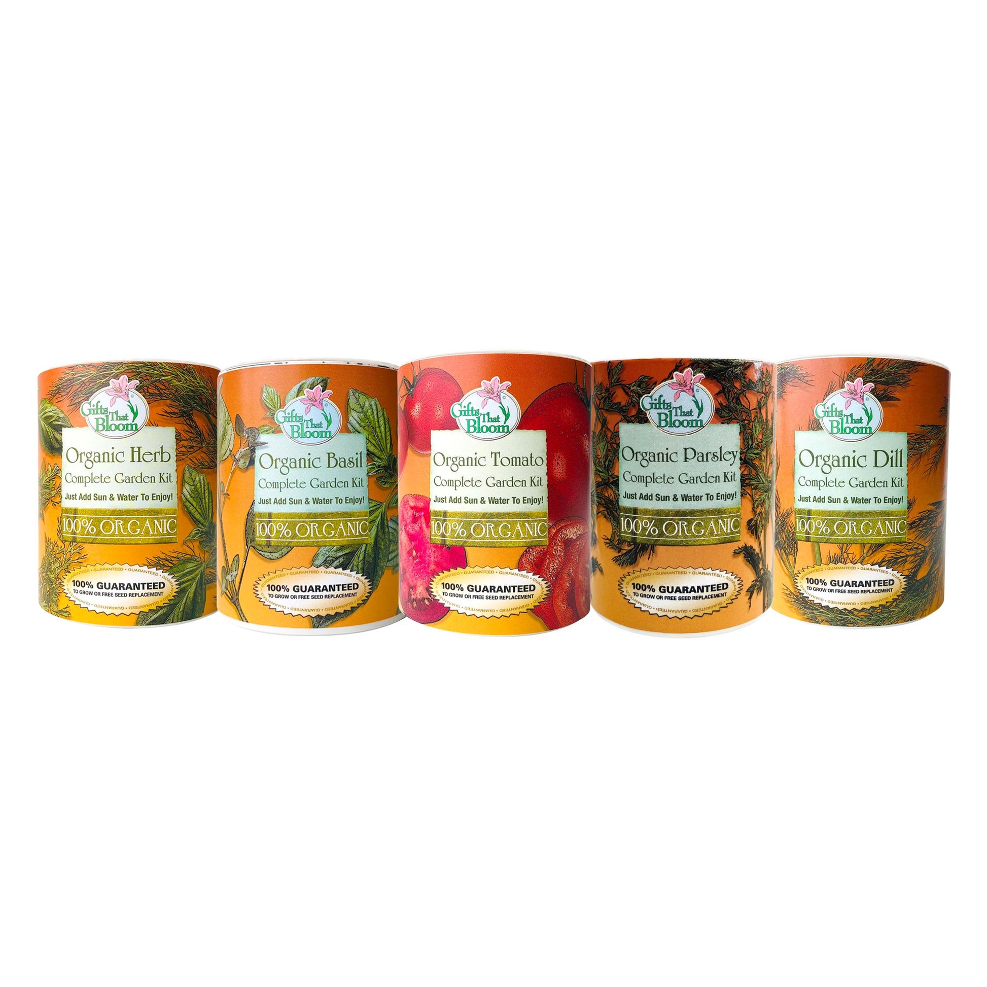The Organic Herb Pre-Pack includes five beautifully themed Grocans: Organic Herb Garden, Organic Basil Garden, Organic Tomato Garden, Organic Parsley Garden, and Organic Dill Garden. Each Grocan is packed with certified organic seeds, a nutrient-rich peat pellet, and simple planting instructions—perfect for beginner and seasoned gardeners alike.
