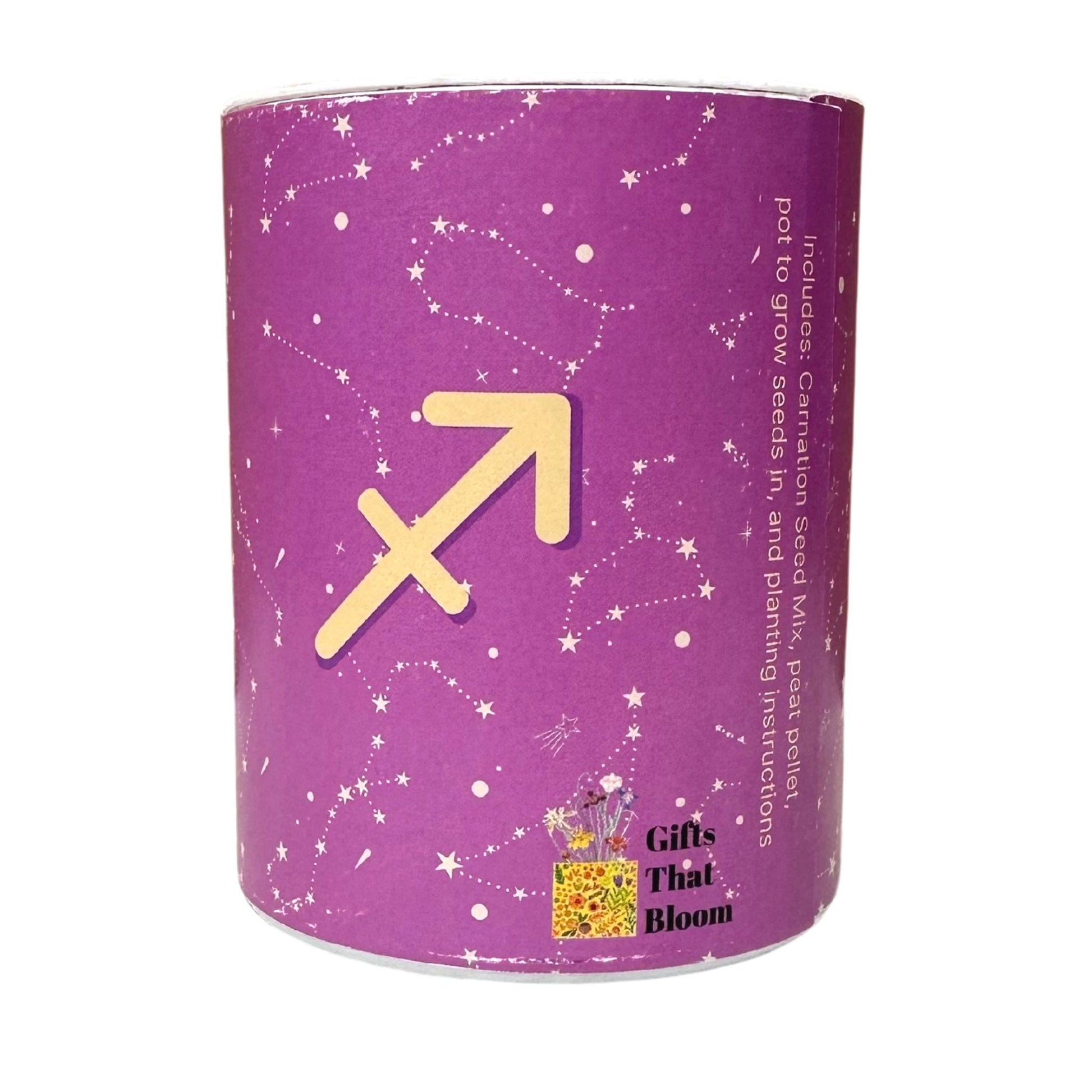 This Sagittarius Zodiac Garden Grocan includes Carnation Seed Mix, peat pellet(soil), planting instructions, and a leak-proof, colorful container to grow seeds in.