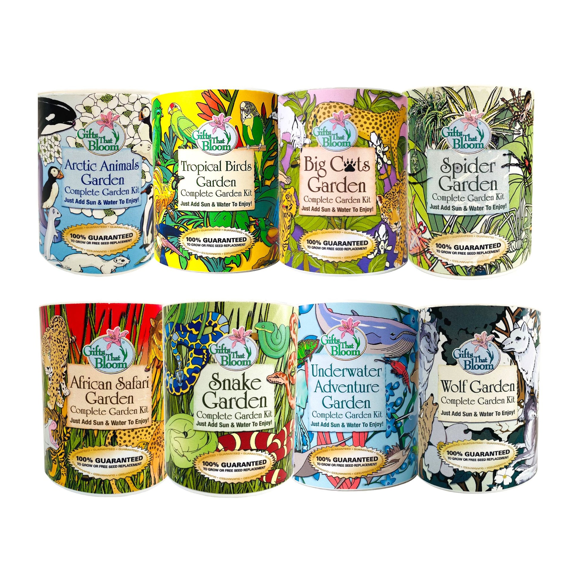 Each Zoo Animal Pre-Pack includes eight themed Grocans: Arctic Animals, Tropical Birds, Big Cats, Spider, African Safari, Snake, Underwater Adventure, and Wolf. Every Grocan features seeds carefully chosen to match its animal theme, along with a nutrient-rich peat pellet for healthy plant growth and easy-to-follow planting instructions that make gardening simple and exciting.